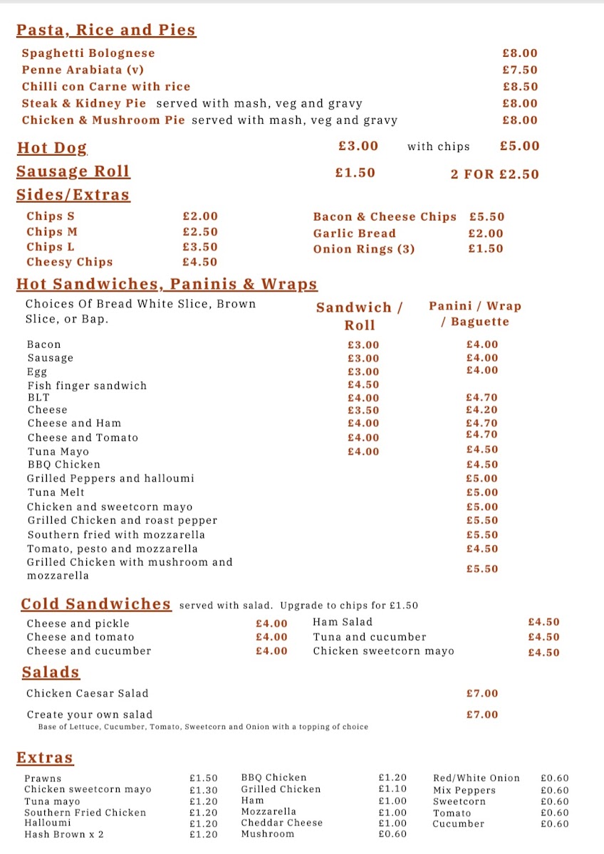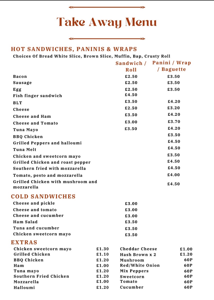 - Hot Sandwiches, Paninis & Wraps: Choices like the classic BLT, fish finger sandwich, and hearty BBQ chicken showcase the cafe's commitment to quality.